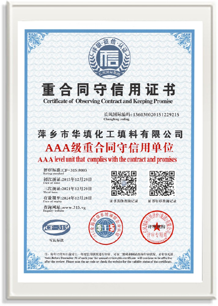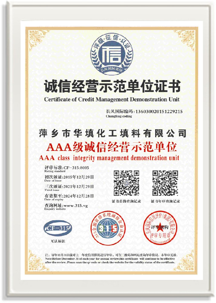 萍鄉(xiāng)市華填化工填料有限公司,位于320國(guó)道、109國(guó)道、浙贛鐵路、昌金高速公路貫穿其中,交通便利,是江西西部一顆燦爛明珠,創(chuàng)建于20世紀(jì)70年代初期,是中國(guó)石油天然氣股份有限公司“能源一號(hào)網(wǎng)”會(huì)員企業(yè)、中國(guó)石化物資采購(gòu)電子商務(wù)網(wǎng)絡(luò)和中國(guó)海洋石油總公司采辦業(yè)務(wù)系統(tǒng)成員單位,是上海大學(xué)江西材料基因組工程產(chǎn)業(yè)研究院工業(yè)陶瓷產(chǎn)業(yè)創(chuàng)新聯(lián)盟基地,且通過(guò)ISO9001:2015質(zhì)量管理體系、ISO14001:2015環(huán)境管理體系、ISO45001:2018職業(yè)健康安全管理體系認(rèn)證的化工填料生產(chǎn)企業(yè)。公司擁有陶瓷、塑料、金屬填料、催化劑、活性氧化鋁、分子篩等產(chǎn)品生產(chǎn)線,現(xiàn)有固定資產(chǎn)3616萬(wàn)元,占地面積3.8萬(wàn)平方米。公司具有悠久的生產(chǎn)歷史、雄厚的技術(shù)力量和先進(jìn)的生產(chǎn)工藝設(shè)備,可生產(chǎn)工業(yè)瓷球(支撐劑)、陶瓷、金屬、塑料質(zhì)的規(guī)整、散堆化工填料及分子篩、催化劑、生化濾料、活性氧化鋁、石化助劑、活性炭、環(huán)保材料、耐火材料等系列的200多種規(guī)格型號(hào)產(chǎn)品。
